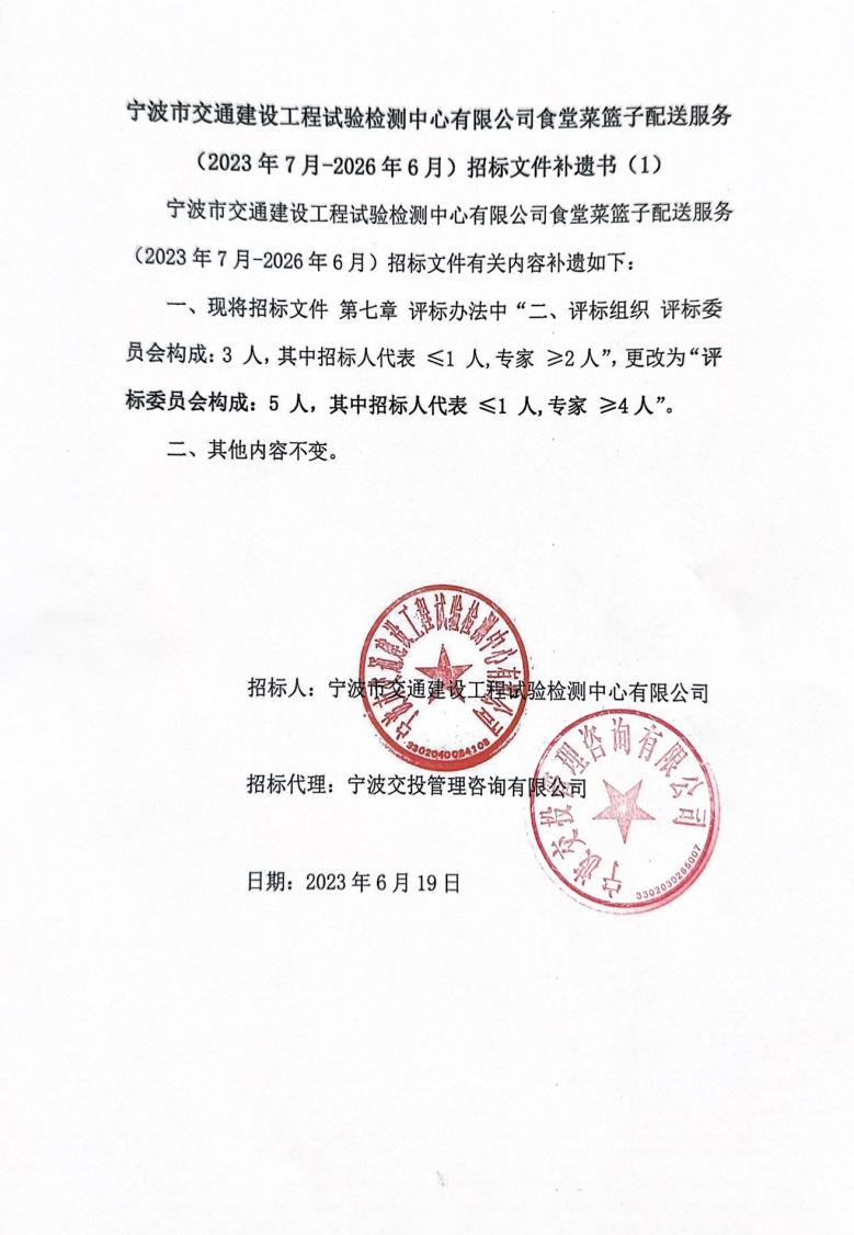 寧波市交通建設(shè)工程試驗檢測中心有限公司食堂菜籃子配送服務(wù)(2023年7月-2026年6月)招標(biāo)文件補遺書(1)